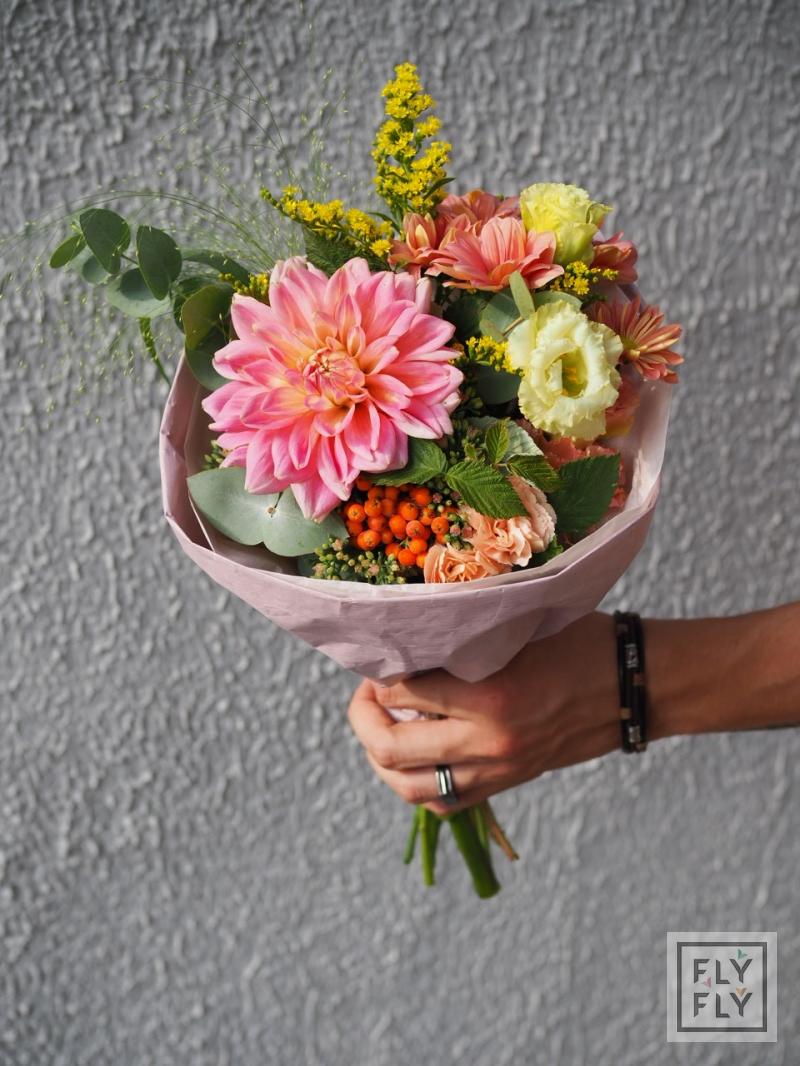 В составе: георгин, диантус, седум, хризантема кустовая, рябина, эустома, эвкалипт, солидаго, паникум и малина.