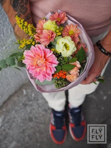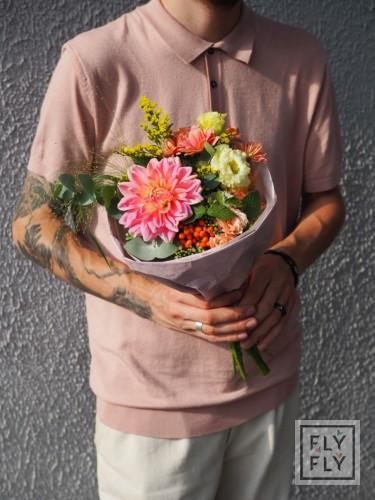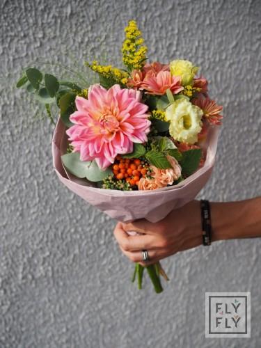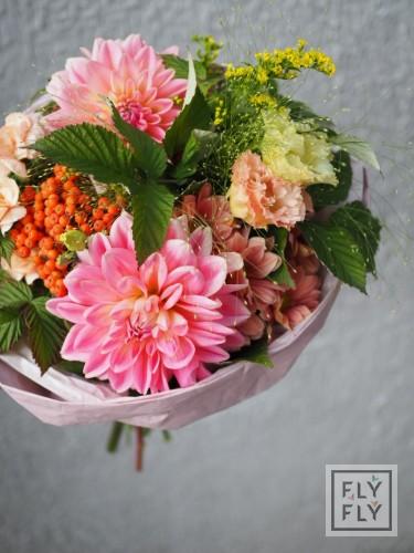 В составе: георгин, диантус, седум, хризантема кустовая, рябина, эустома, эвкалипт, солидаго, паникум и малина.