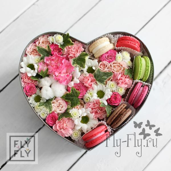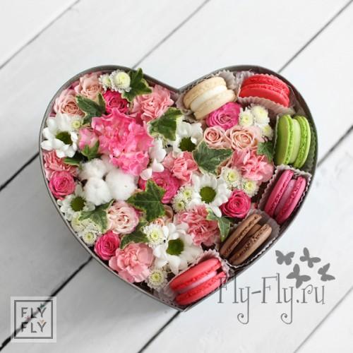 Нежнейшее, словно вбитые сливки, сочетание кружевных розочек и воздушных гвоздичек в коробочке сердечке точно заставит радостно улыбнуться ту счастливицу, которая получит такой романтический подарок. Цветы находятся во флористической губке и будут радовать не меньше недели. А нежнейшие пирожные украсят любое чаепитие.